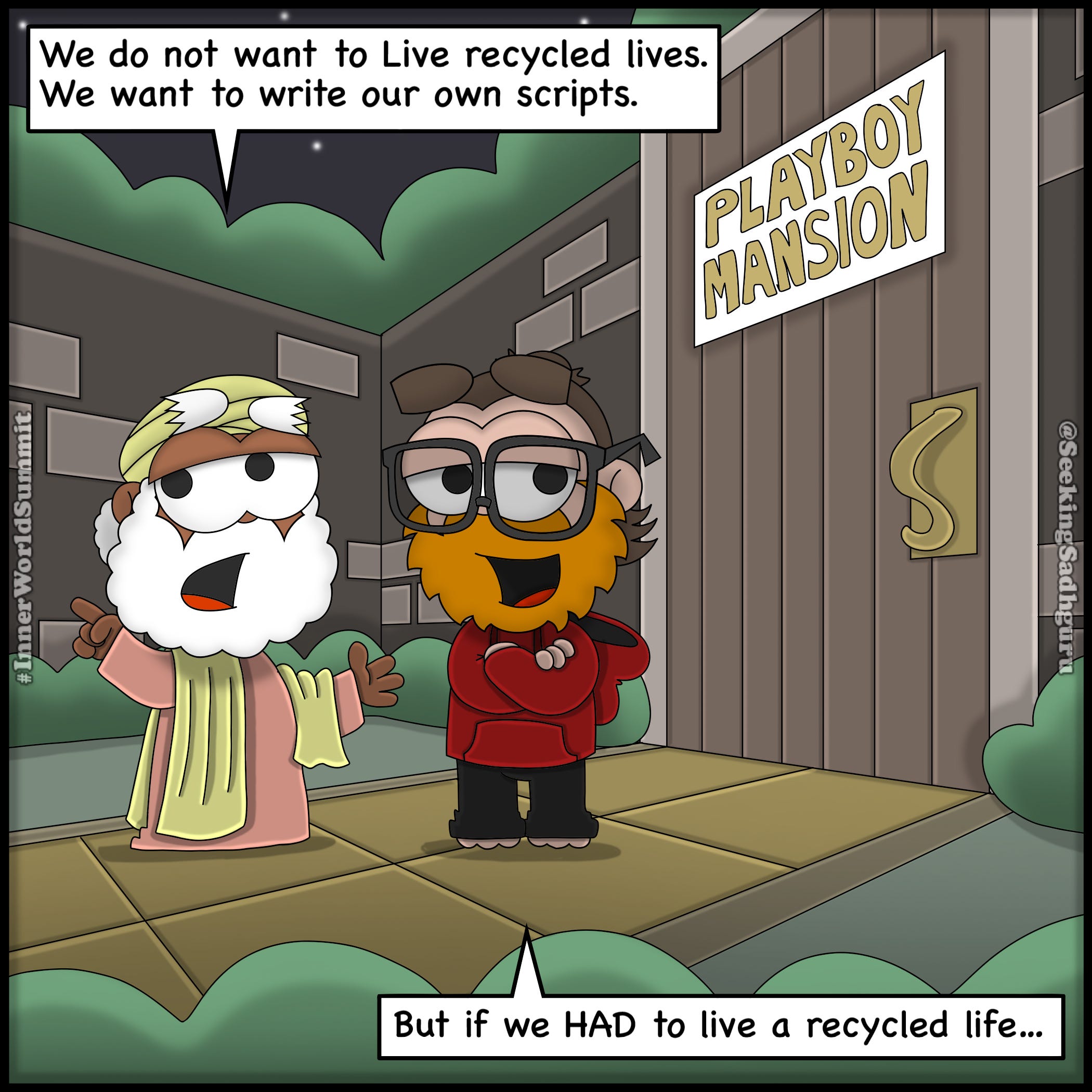 Tonight’s note opens with a bold claim—we don’t want recycled lives, we want to write our own scripts—then immediately questions whether scripting life at all is the trap. A cartoon joke about the Playboy Mansion becomes a doorway into deeper inquiry about desire, imitation, and borrowed definitions of success. The host circles ambition, enlightenment, family, and identity before Sadhguru cuts cleanly through the illusion: you don’t even control your breath or heartbeat, so the fantasy of being the “hero” may itself be false. Truth isn’t authored. It’s lived.